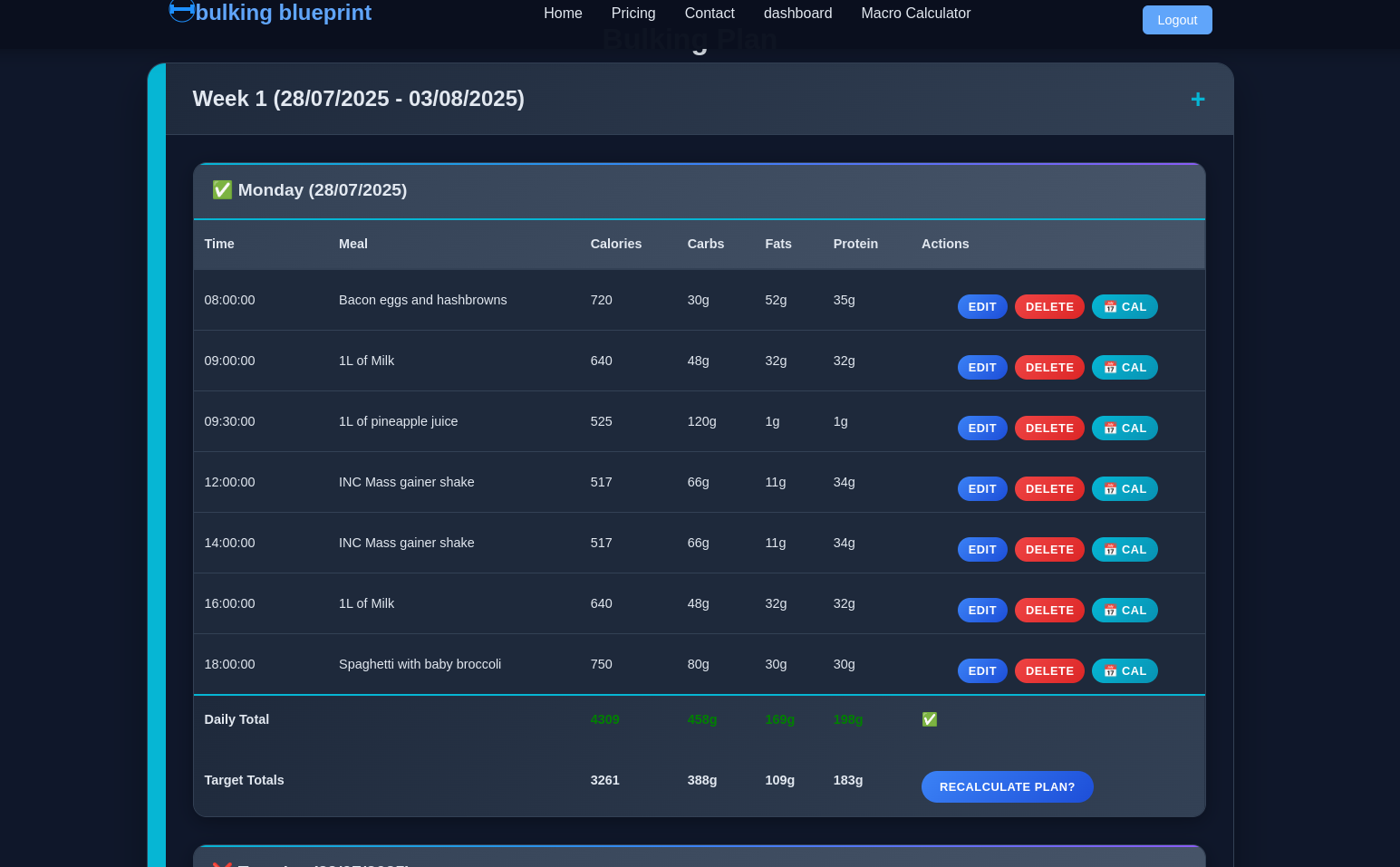 See your complete daily meal schedule at a glance. Track your progress, check macro targets, and stay on top of your bulking goals with our intuitive dashboard.